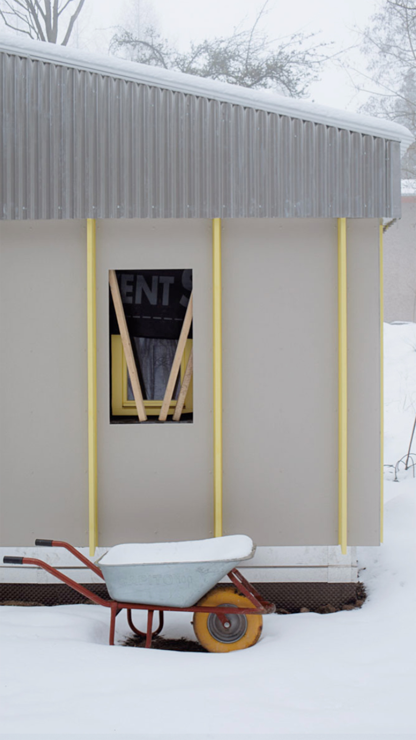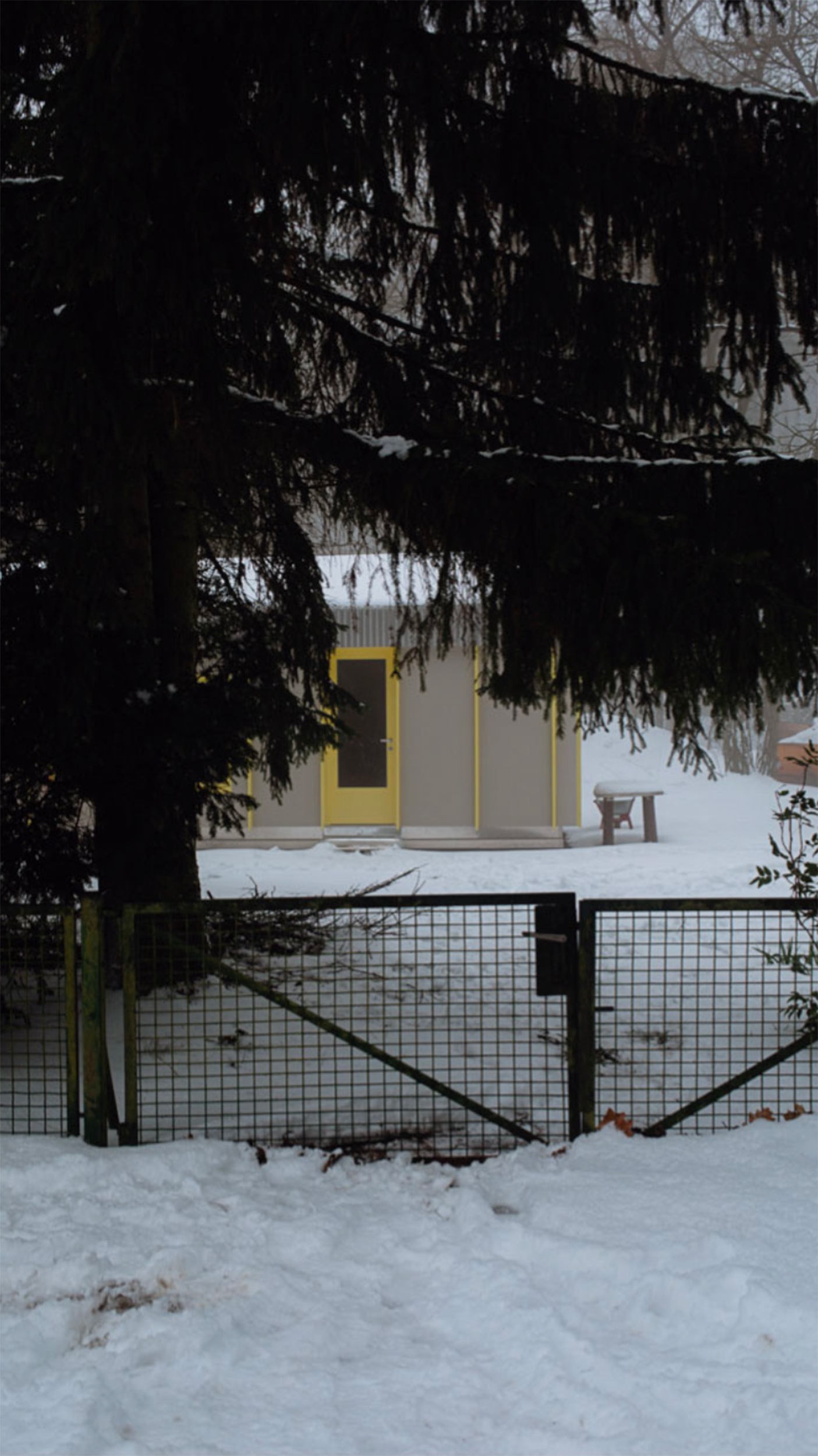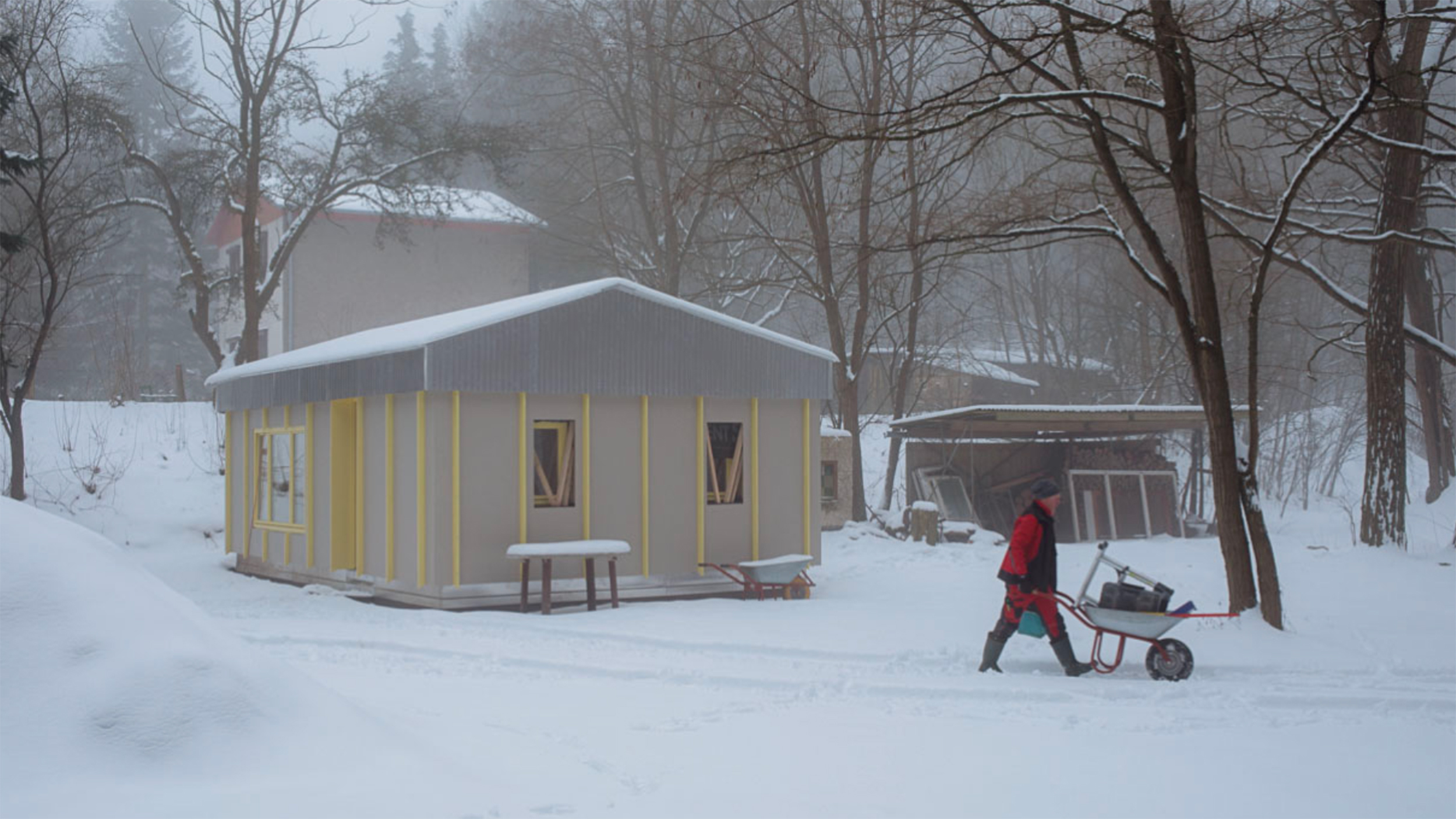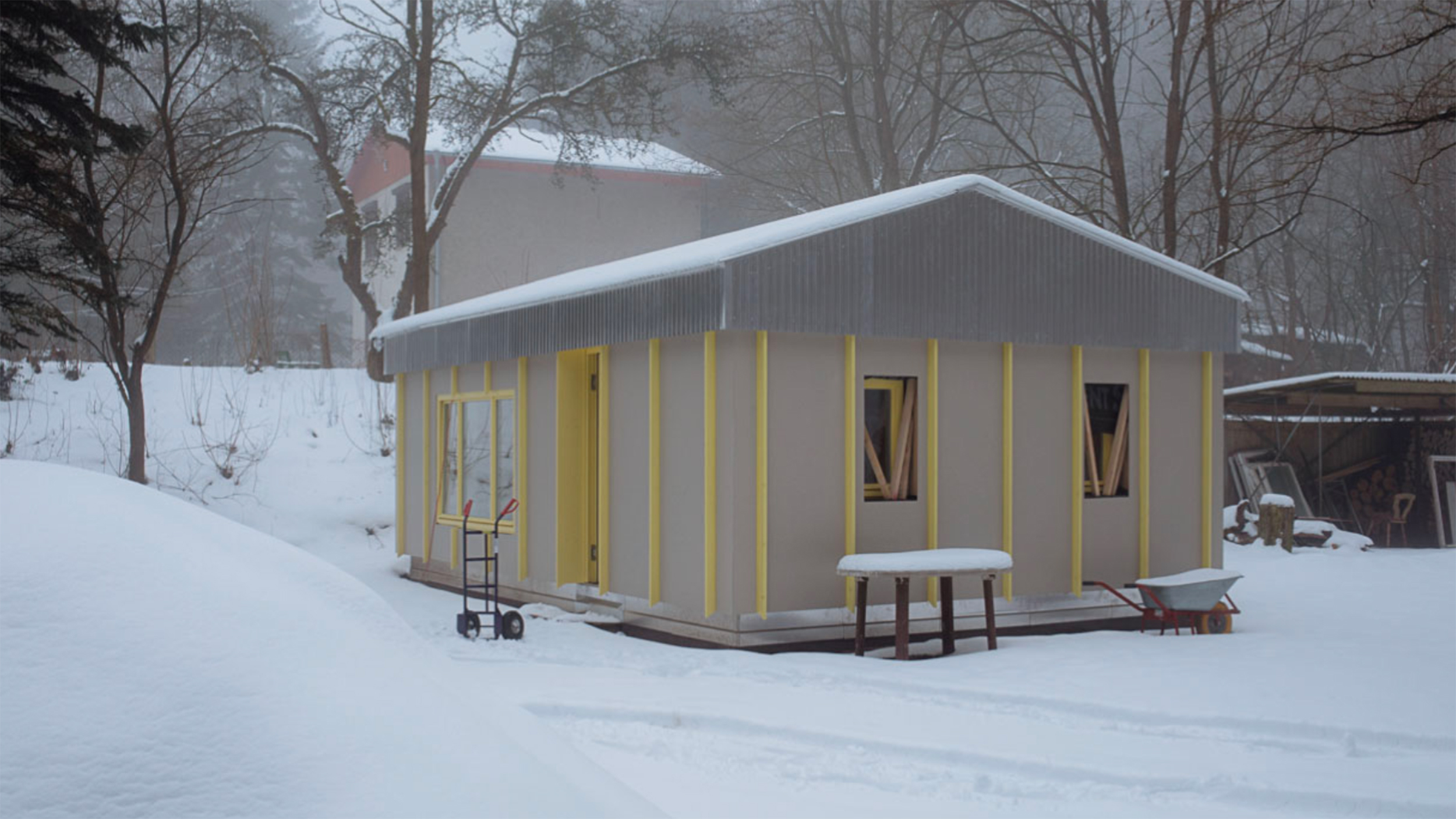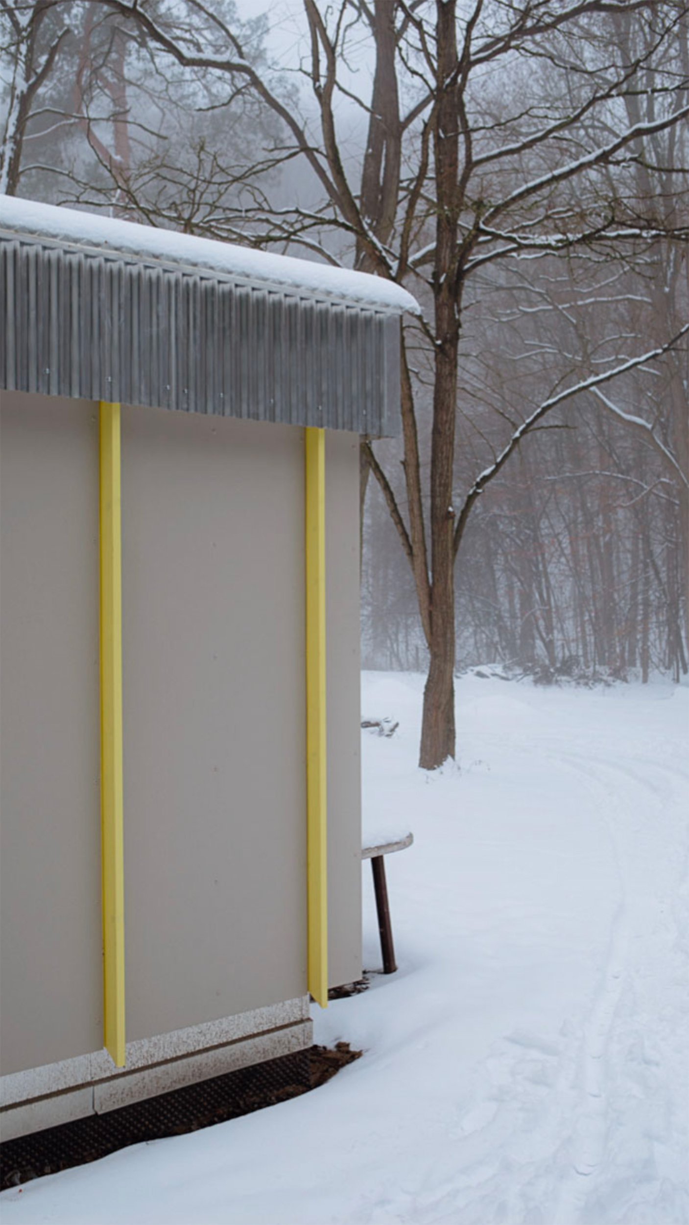 Während die tragenden Außenwände der Datscha erhalten blieben, wird die Innenaufteilung den neuen Bedürfnissen der Familie und ihrer Freunde angepasst: Es entsteht eine robuste Küche, die durch eine doppelflügelige Tür mit einem vielseitig nutzbaren Raum mit Klappbett verbunden werden kann. Die neuen Fassaden- und Dachverkleidungen greifen Ideen von Vorfertigung, Wiederholung und Materialität aus der Entstehungszeit der Datscha und der DDR-Architektur allgemein auf.